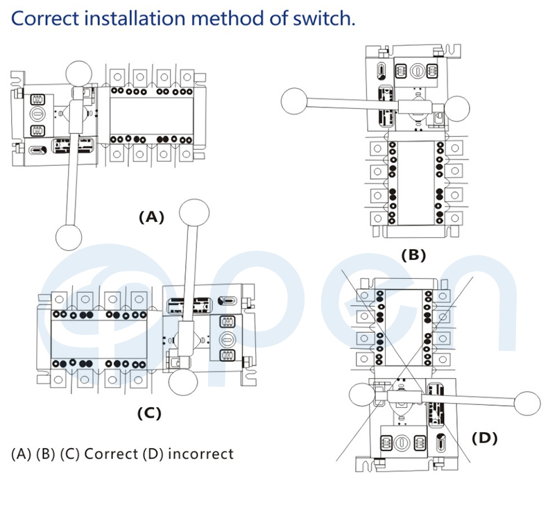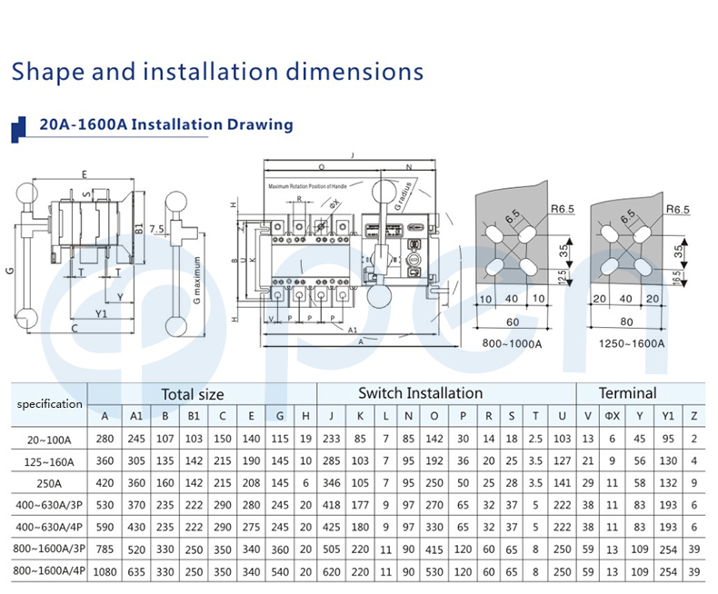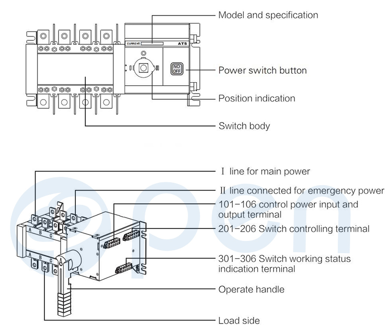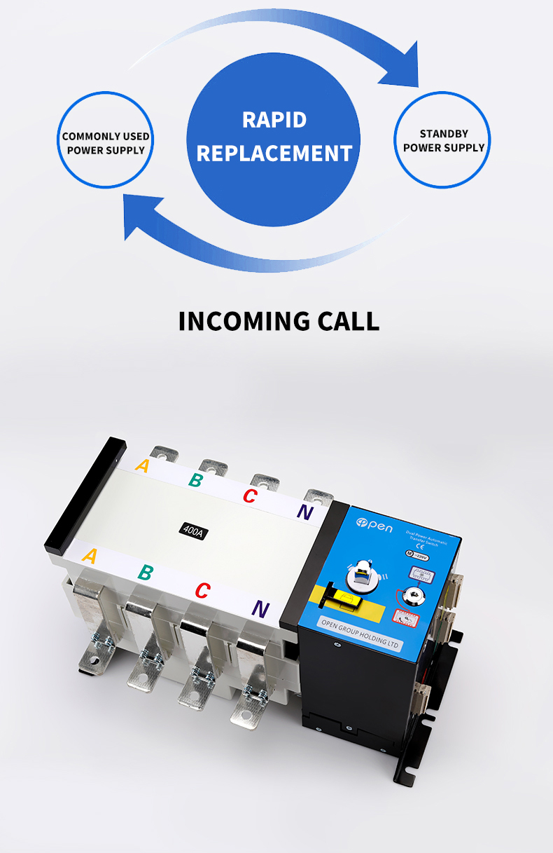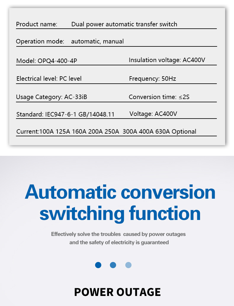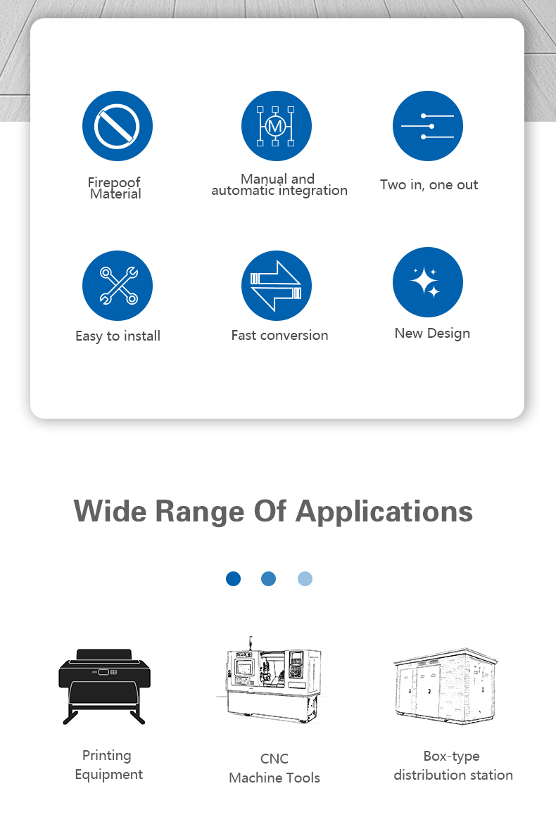 400V, rated current of 63A and below. Choice and conversion between two power supply according to the needs. ATS have protection