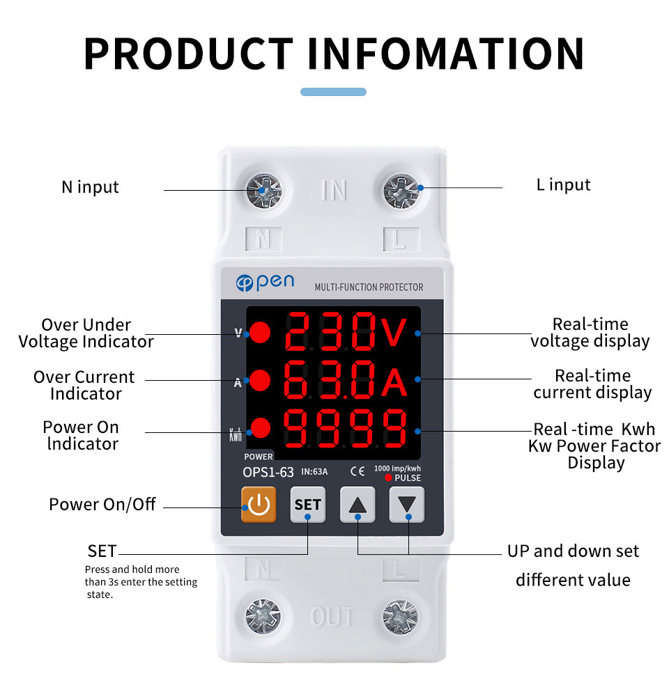 63A 230V 3IN1 Display Din rail adjustable over under voltage surge protector relay over current protect Kwh Power watt Meter