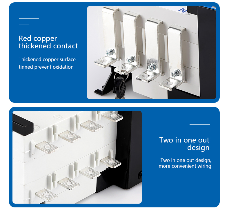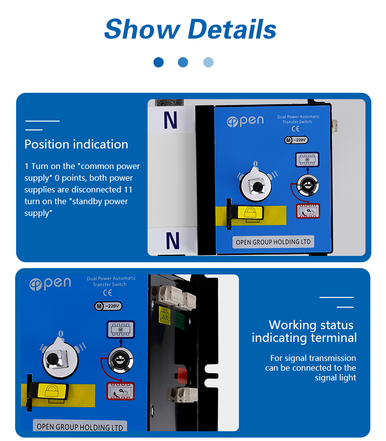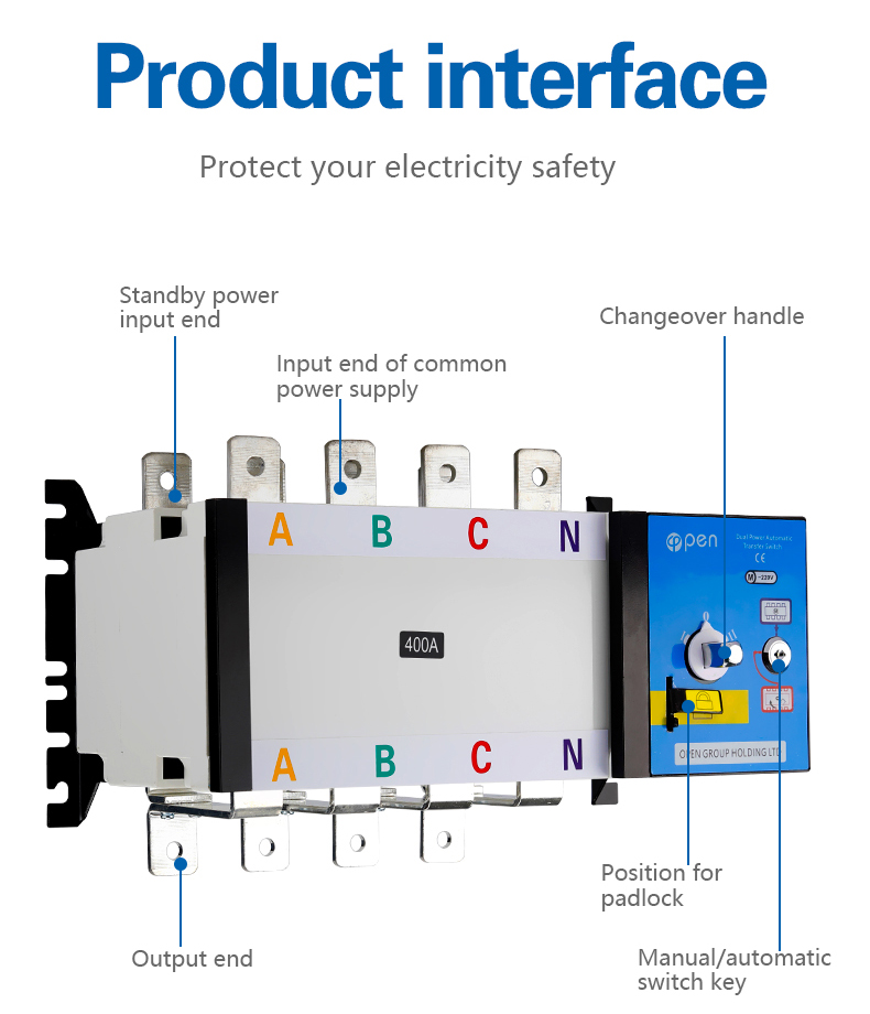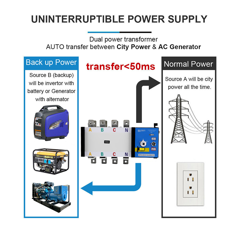 400V, rated current of 63A and below. Choice and conversion between two power supply according to the needs. ATS have protection